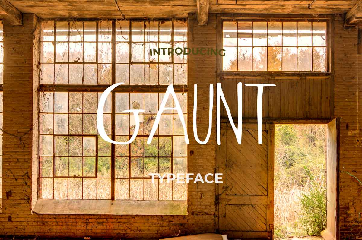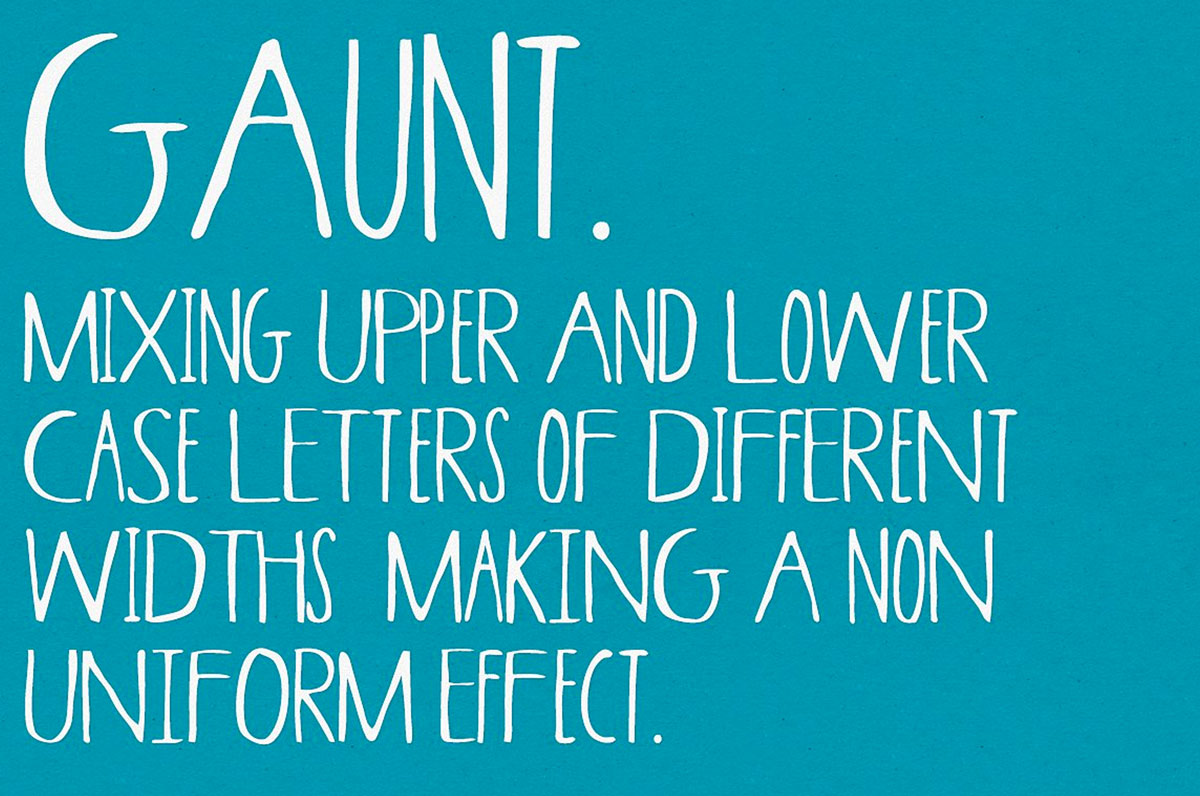 Gaunt is an uppercase varying width hand drawn sketchy thin face. Varying uppercase widths of the font are used for the upper and lower case of the font, allowing you the ability to mix them to give an unpredictable non-uniform effect by mixing the two randomly.